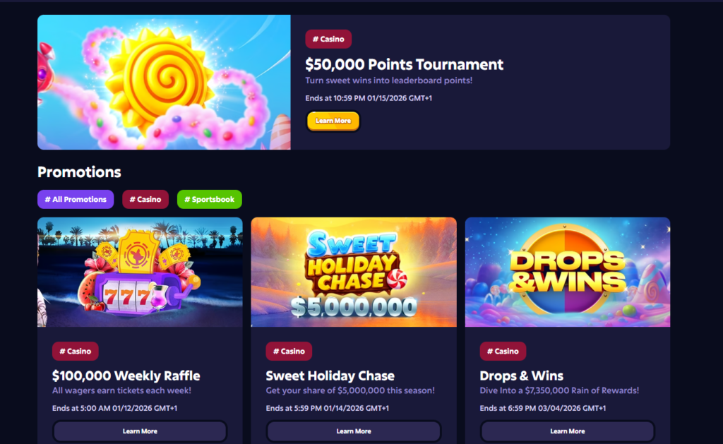 This is a seasonal reward chase with a shared prize pool distributed over time. Players earn progress through normal casino play, competing for a slice of the total rewards. It’s time-limited, clearly tracked, and designed to reward consistency rather than short bursts of play.